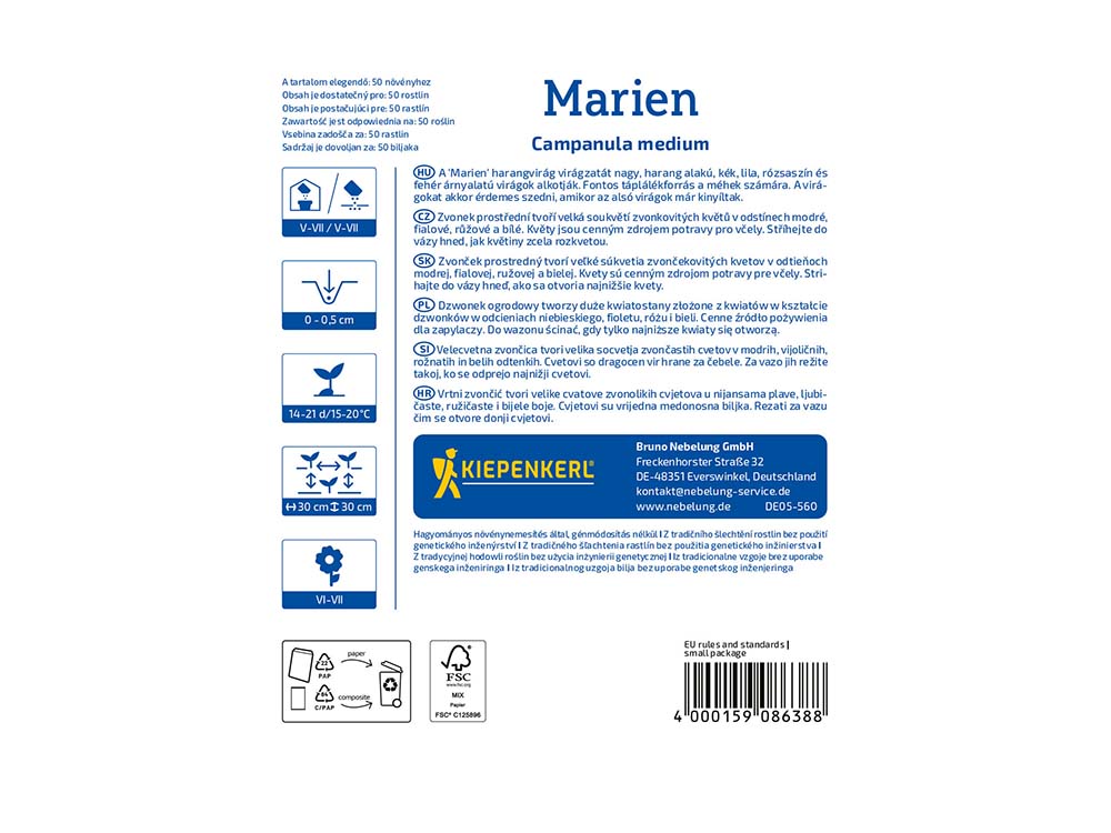 A Kiepenkerl harangvirág Pracht-Mix korán tavasszal, csomókban nyíló, csupor alakú virágaival díszítő, kétnyári növény. Jól kombinálhatók sarkantyúfűvekkel (Delphinium), díszmákkal (Papaver), bugatölcsérrel (Penstemon) de akár egy-egy ágyás kiemelt helyén is viríthatnak.